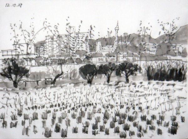 うどんのチエン店です、もともとは洋菓子店だった店舗です、南面が表ですが北側の裏が面白く感じました、これぐらい引いて描かないと全体がつかめません、形を取って明暗を付けただけで、細かいところまでは描いていません
