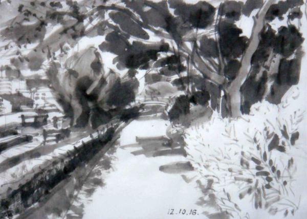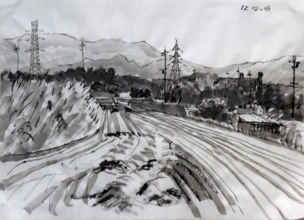 昨日で狭山美術協会展が終わりました会場にお運びいただいた方、ありがとうございました。30周年を目指して又一歩を踏み出します、温かいご支援を今後ともよろしくお願いいたします。今日の絵、狭山池の西側310号線より東側を見ています、間に狭山池が入っているのですが、絵では分りません。