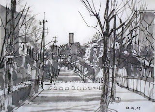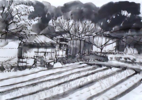 昨日の絵です、墨色が濃すぎて暗い感じになりました。郊外の畑にはため池や小屋が多くみられ、 小屋も魅力的なものが多くありちょいちょい描いています、耕運機の倉庫だったり、玉ねぎの収納庫だったり、 わらが収納されていたりしますが、小屋だけよりも小屋のある場所的な雰囲気も描けたらと思います。