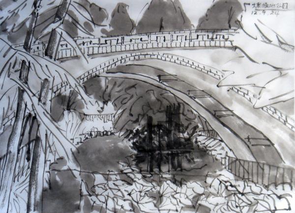 赤とんぼの皆さんと行ったのですが、フェンスがしっかり張り巡らされていて私が予定したポイントには入れませんでした。仕方なく蓮池の向こうの橋を描きました。池の端は