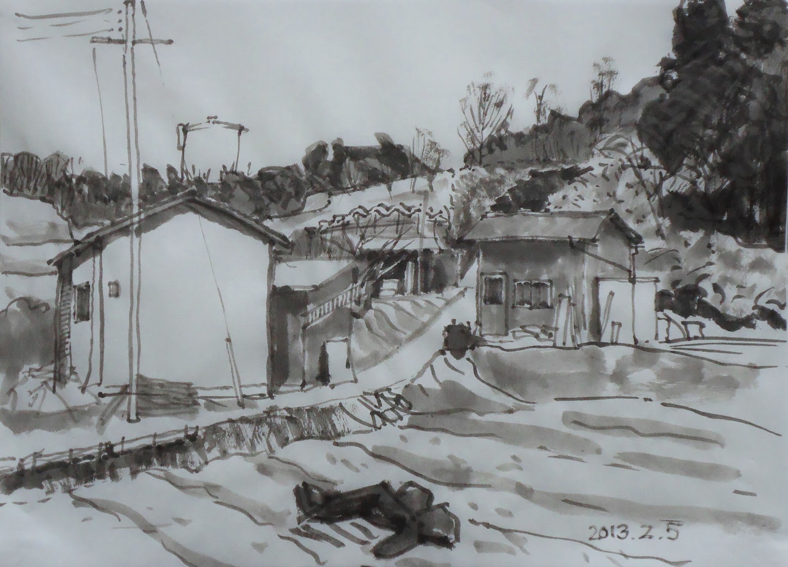 去年切倒されてしまった桃畑に行ってみた、すっかり根も取り除かれ畑の状態になっていた、何も植えられていない状態で、あっけなく思ったが、取りあえず一枚スケッチした。