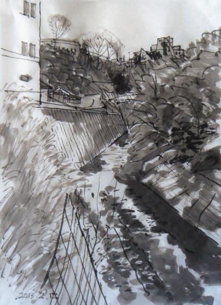 今日から、実際のスケッチに戻りマス、書き直すという行為も自分の感じ、心が反映され、より作品ぽく昇華されるのですが、往々にして平凡に描き写ししただけに終わったりもします、実際の現場でのスケッチは稚拙であっても臨場感にあふれ、後でみなをしたときにいろいろ思い出されて好ましいものです。今日の絵は狭山池から流れ出る西除川の姿です、